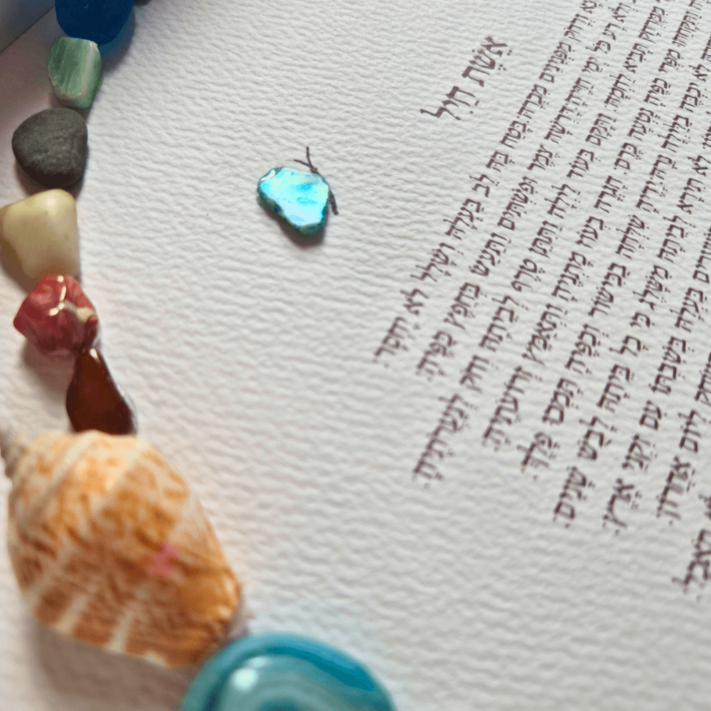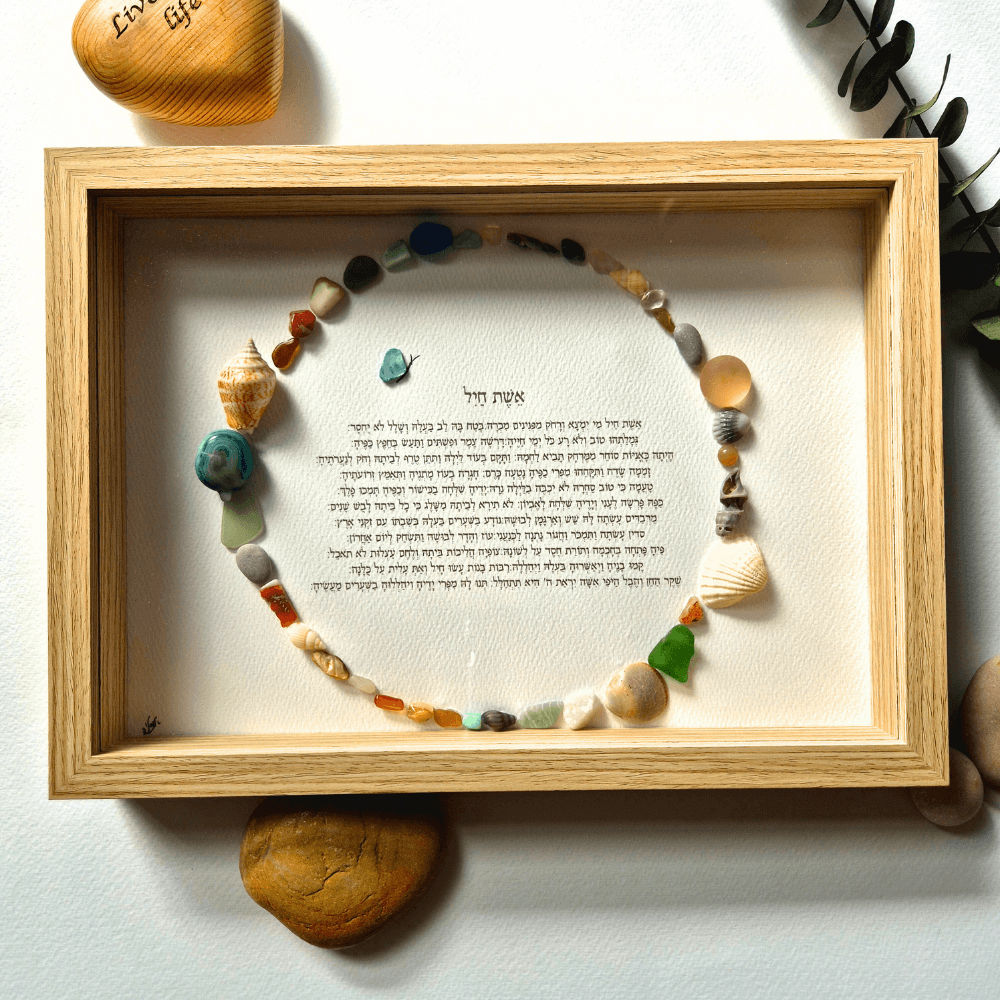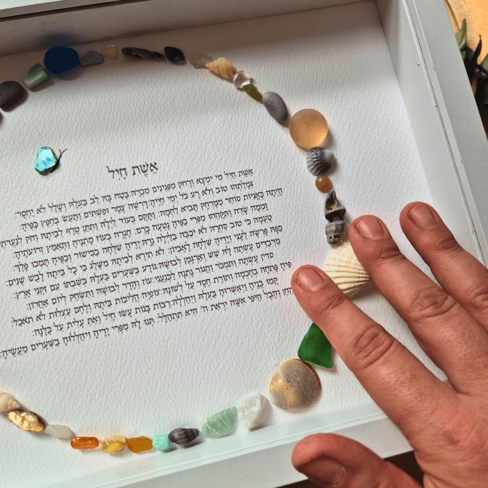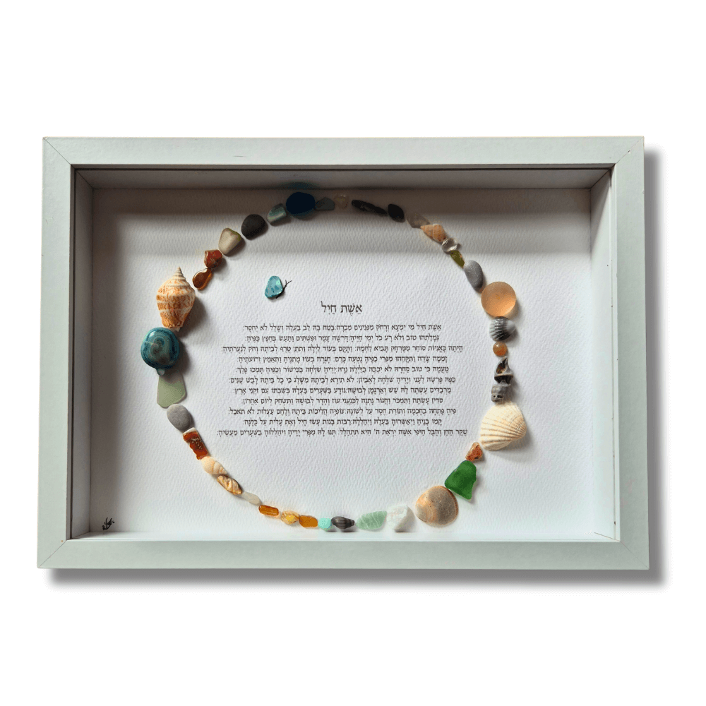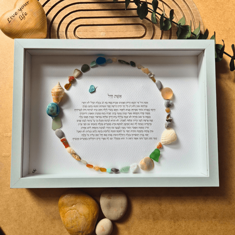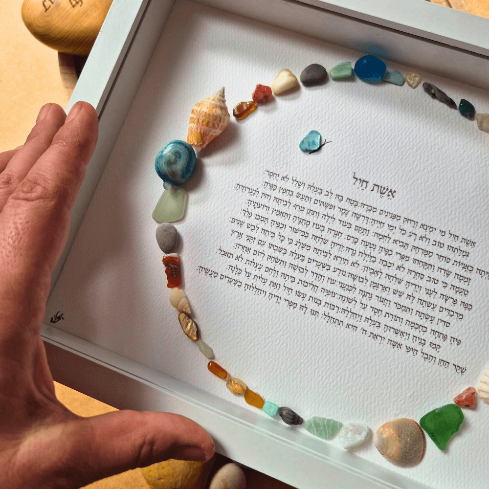 במרכז המעגל מופיע הפסוק "אשת חייל מי ימצא", ולצידו פרפרית כחולה עשויה מצדף טורקיז זוהר, כאילו עפה אל החופש והאור.