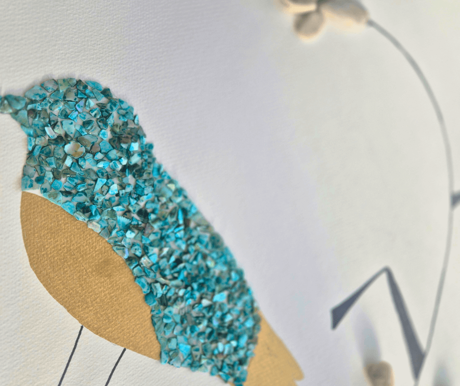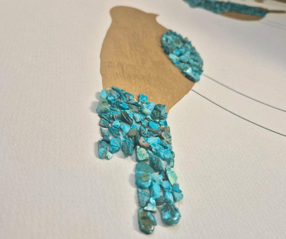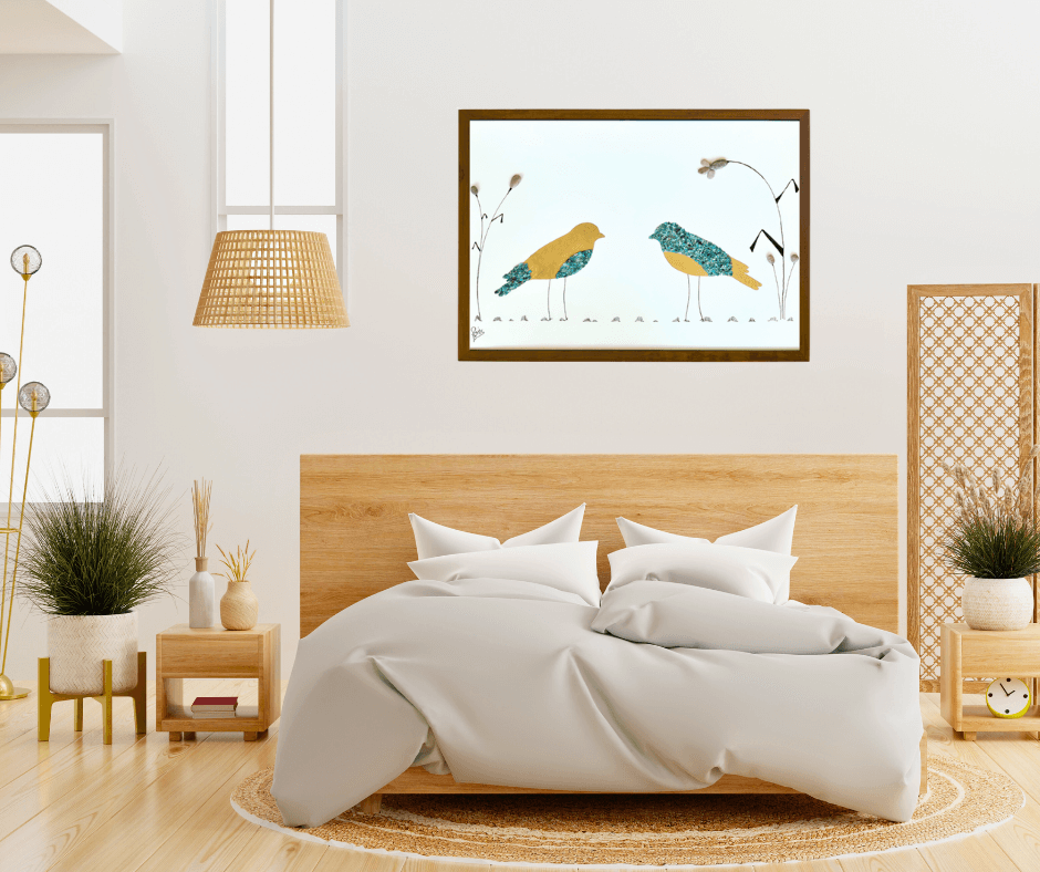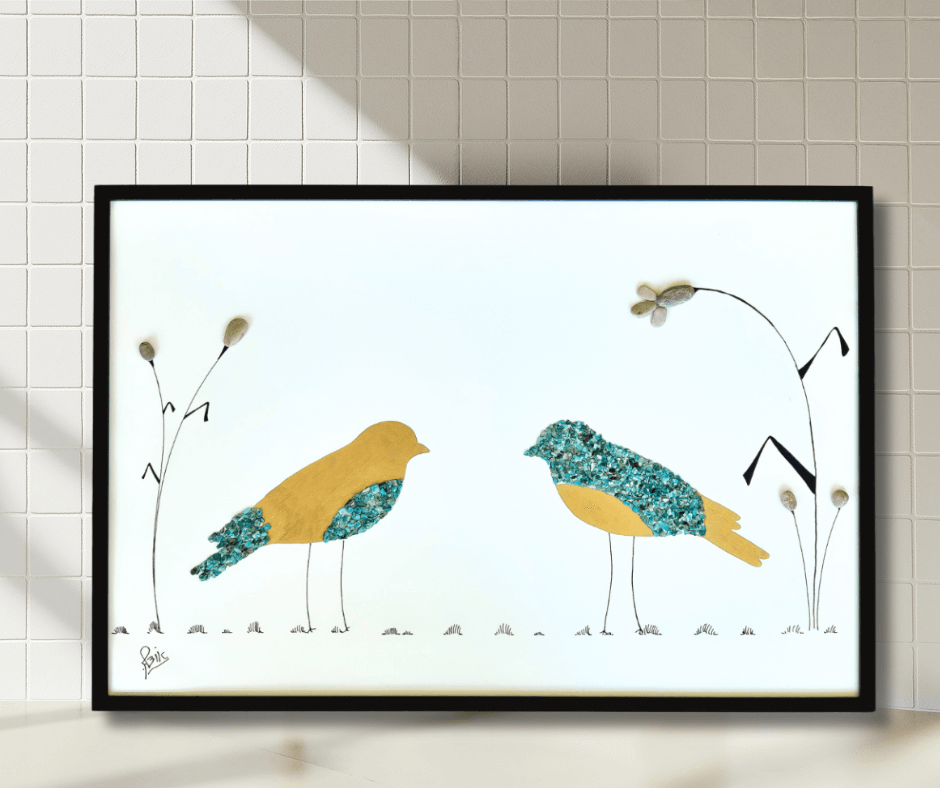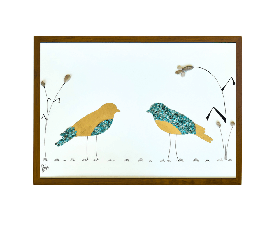 ביצירה שתי ציפורים עומדות זו מול זו שציירתי בגווני זהב וטורקיז המשתלבים בהרמוניה. בכל משיכת מכחול, כל פרט בנוצות, כל קו -הושקעה מחשבה ואהבה.