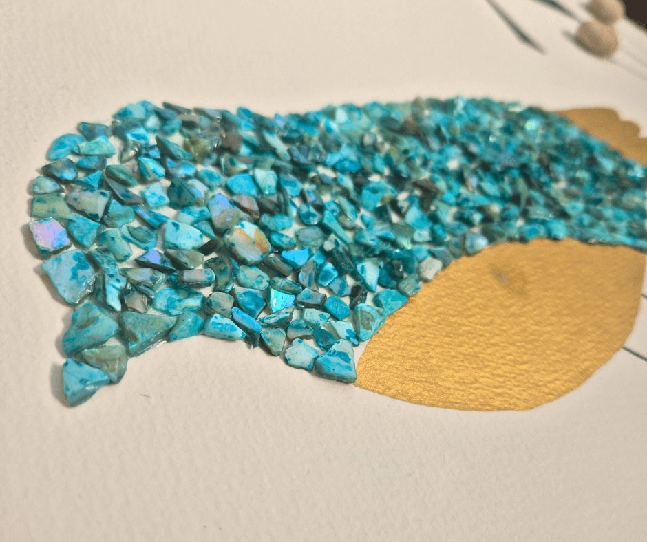 איסוף ידני של כל חלוק וצדף, המקוריות של הציור שציירתי  בצבעי אקריליק, הדבקה של שברי הצדפים הכחולים אחת אחת , עיצוב הפרחים - יצרתי כל פרח מחלוקי ים שעיצבתי והדבקתי,  כ - 10 שעות עבודה - השקעתי שעות רבות ביצירת כל פרט. אין שני - בגלל שזו עבודת יד מלאה, אי אפשר ליצור שוב יצירה זהה