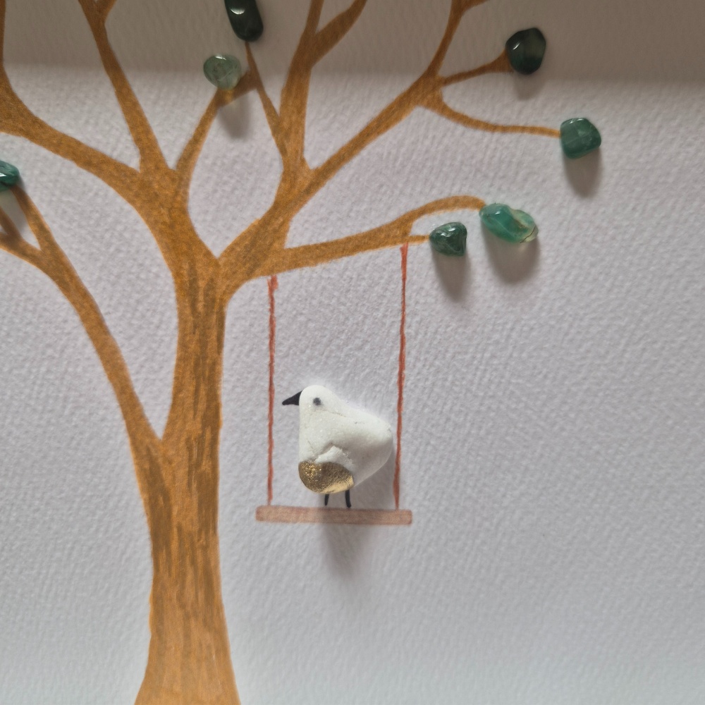 ומתחת לעץ, תלויה נדנדה קטנה וציורית. ועליה - ציפור. חלוק נחל אחד שקיבל חיים, שהפך לנשמה קטנה שיושבת שם בשלווה, מתנדנדת בעדינות, נהנית מהצל של העץ. היא לא ממהרת לשום מקום. היא פשוט... נמצאת. מאמינה. מחכה בסבלנות.