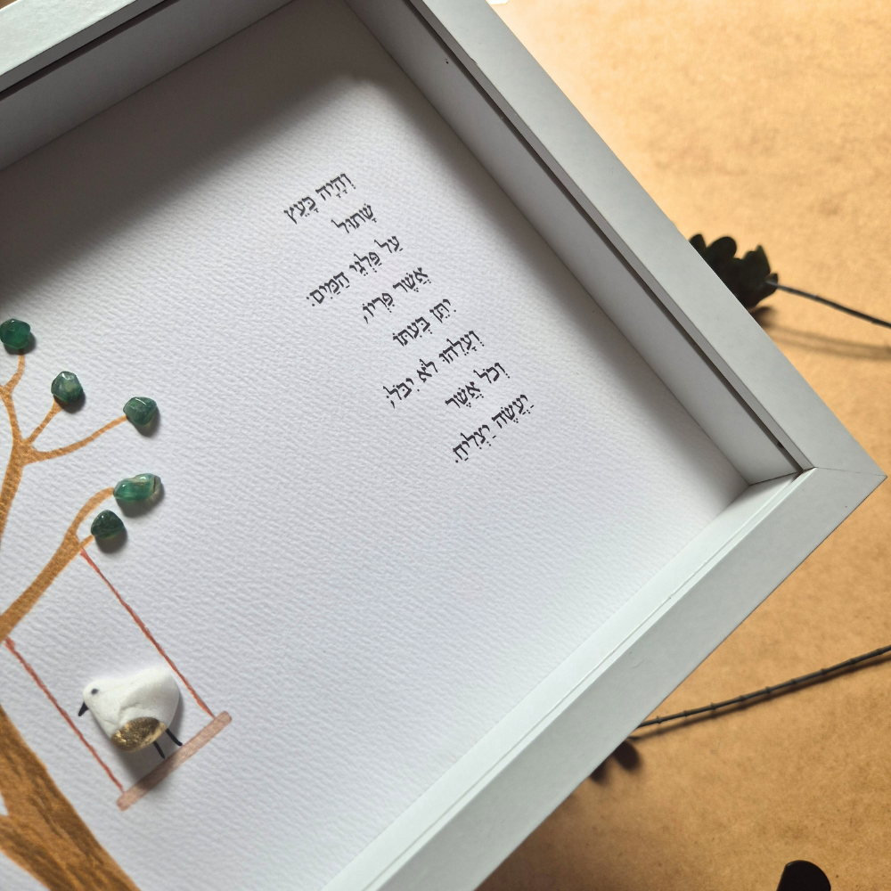 הטקסט העברי הוא מתהילים - פרק א', פסוק ג'. זו ברכה עתיקה ועמוקה. הבטחה שמי שנטוע היטב, מי שמאמין, מי שמתמיד - הצלחה תבוא. אולי לא מיד, אולי לא מחר, אבל היא תבוא.