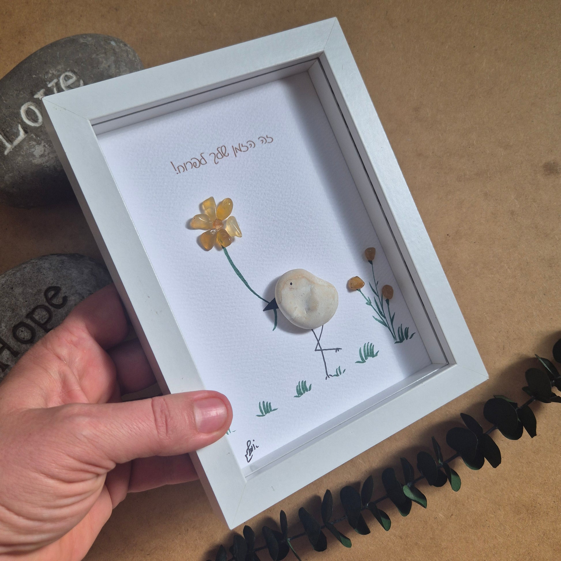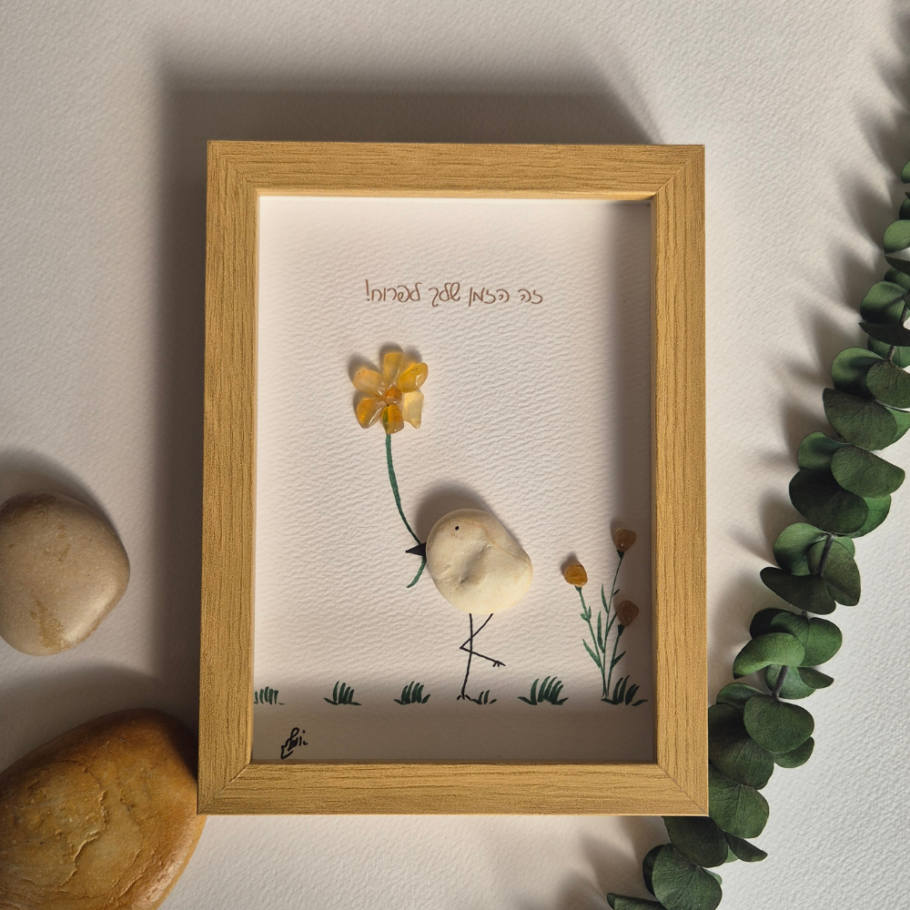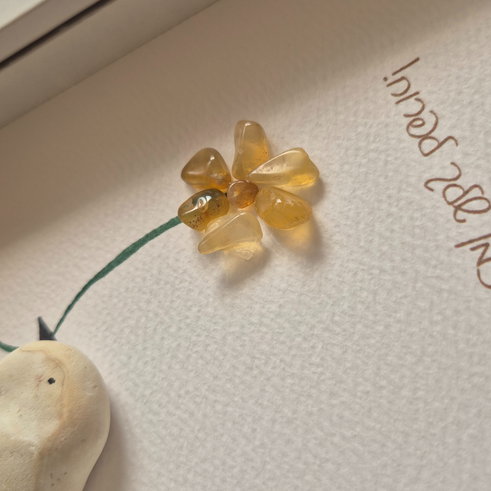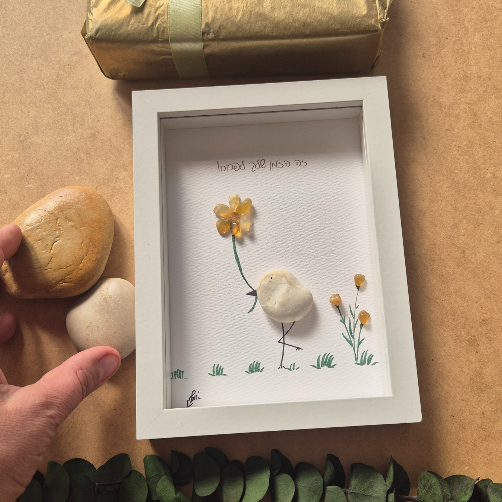 אבן חלקה ועדינה, שנדדה עם הגלים עד שמצאה את דרכה אליי מחוף הים, הפכה לאפרוח קטן ותמים. ביד הקטנטנה שלו - פרח מזהיר, עשוי מאבני חן בגוון זהב חם ומלא חיים מאבני חן אגת.