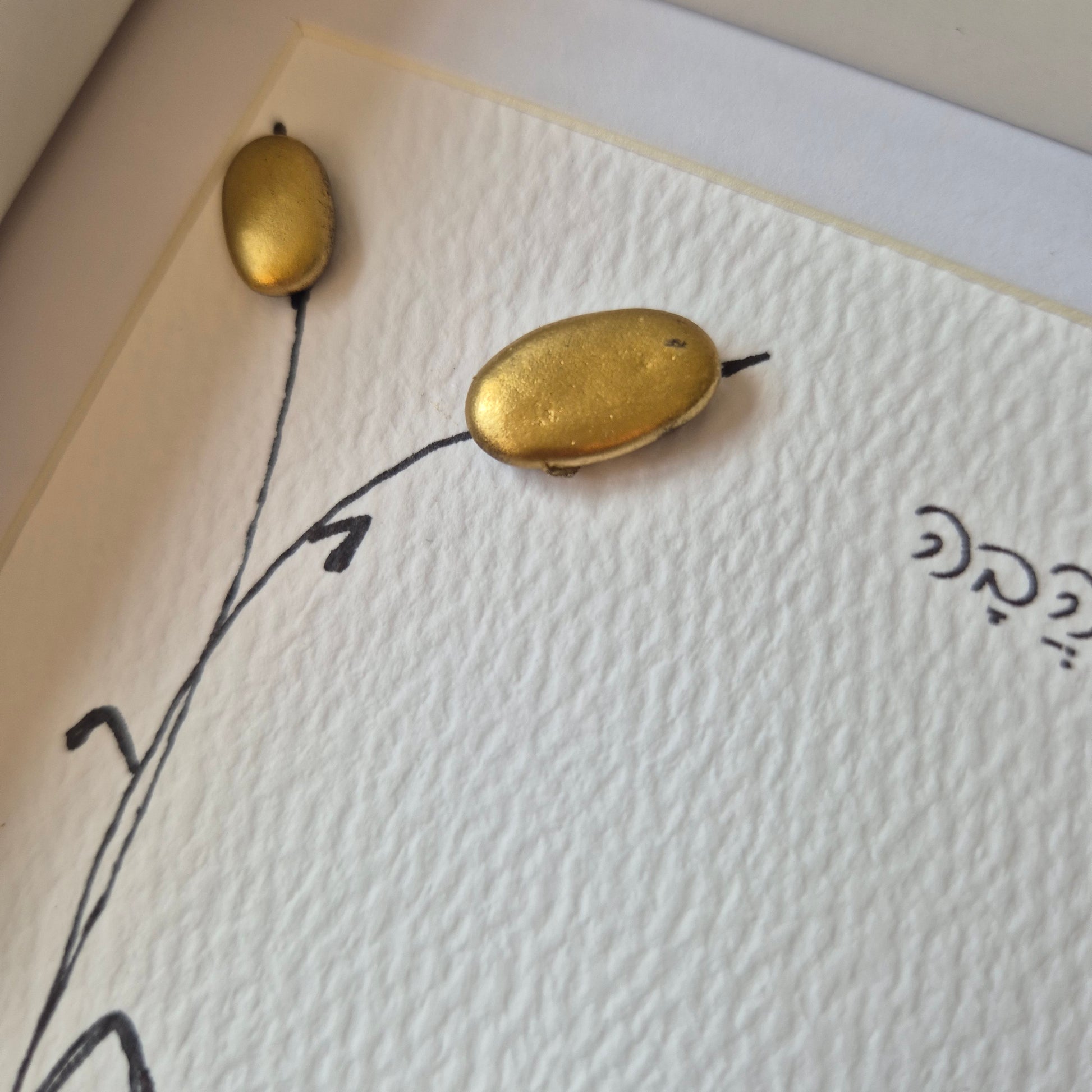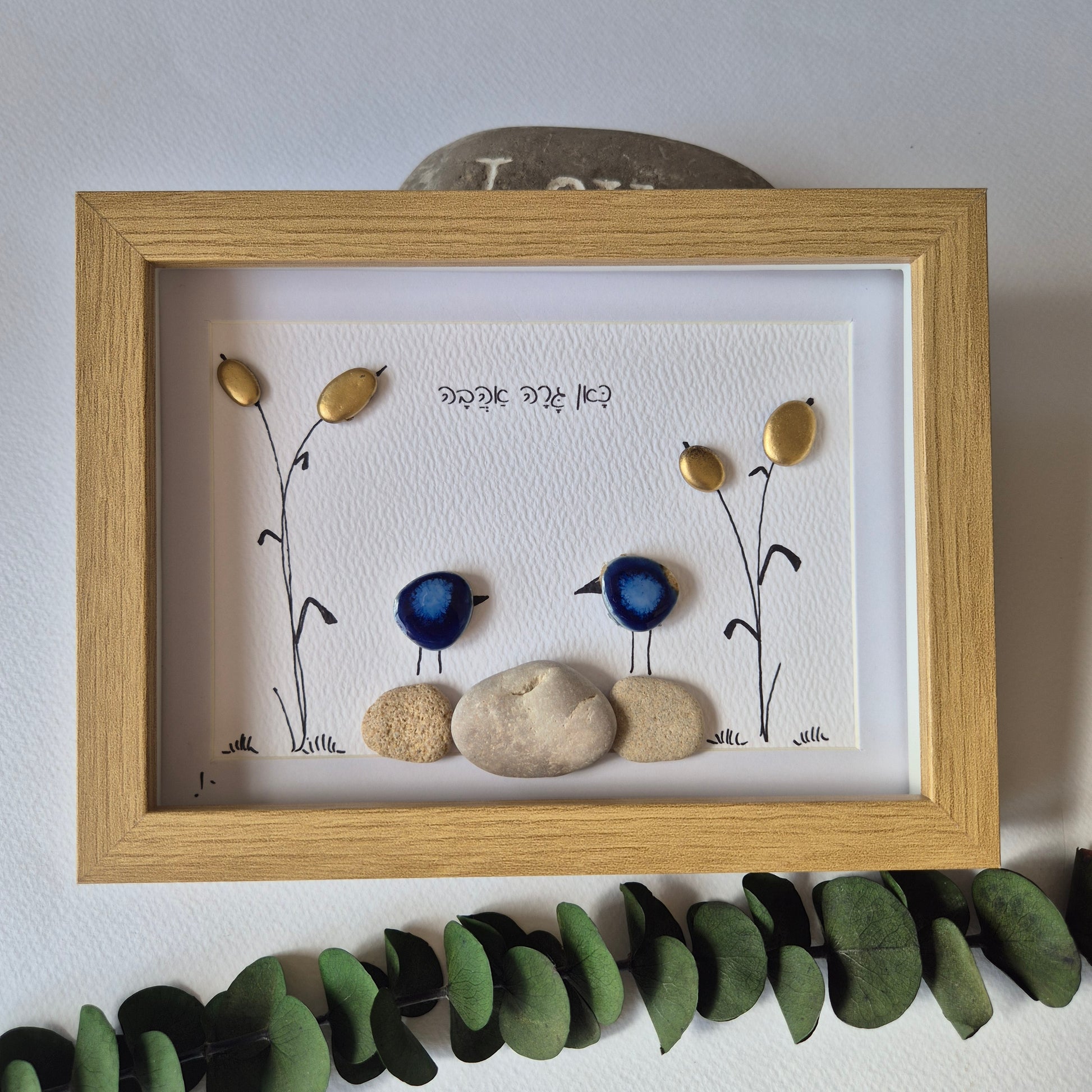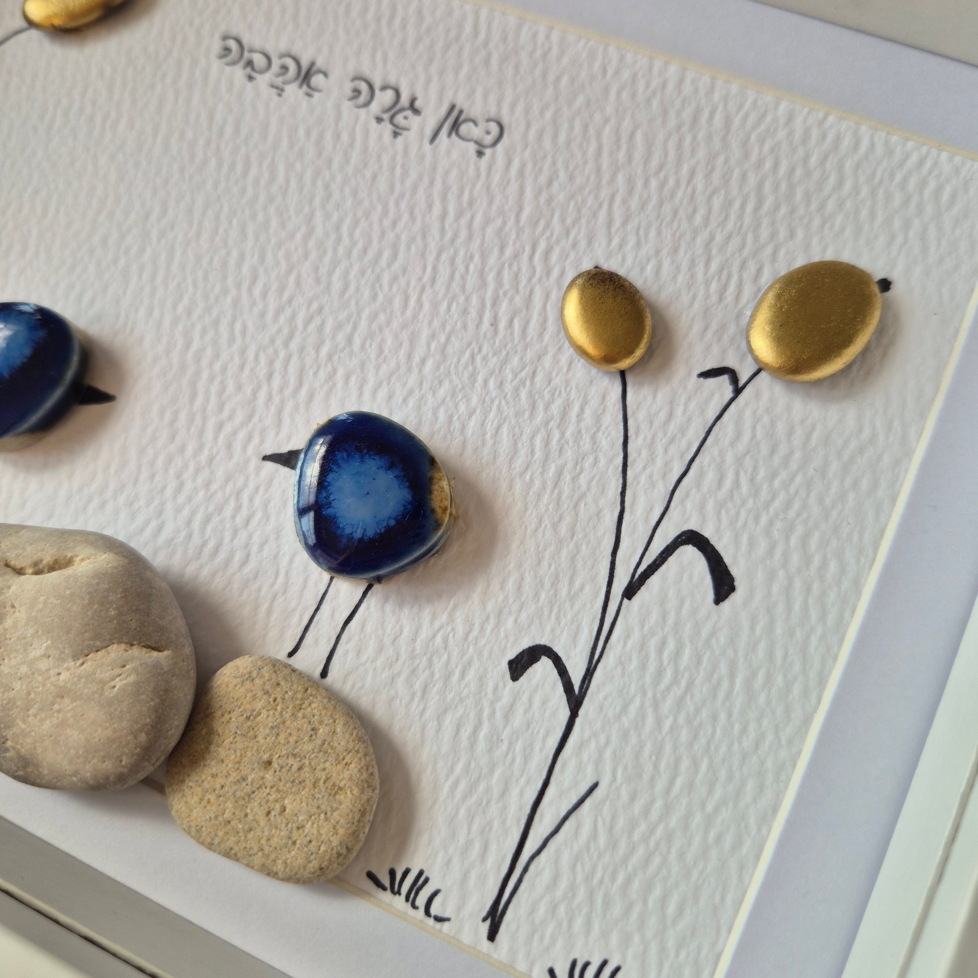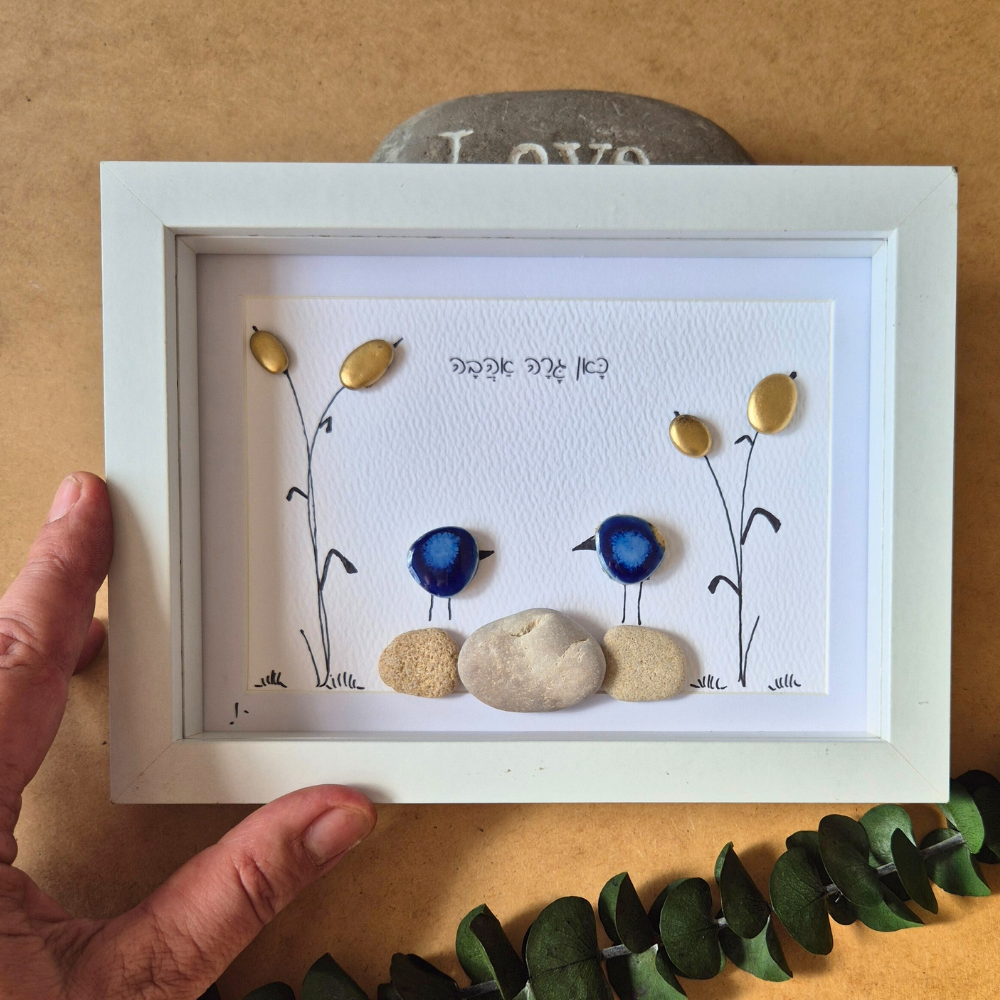 על היצירה: יצירה ייחודית זו משלבת בעבודת יד קפדנית אבני קרמיקה כחולות עמוקות וחלוקי נחל מוזהבים, המסודרים בקומפוזיציה עדינה ומרגיעה. שתי דמויות מופשטות, עשויות מאבני קרמיקה כחולות, מרחפות על רקע של אדמה חולית ופרחים זהובים, יוצרות תחושה של קלילות, חיבור ואיזון.
