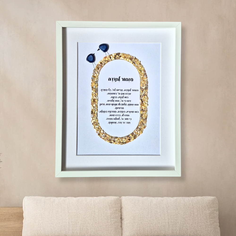 יצירה ייחודית בעבודת יד המבוססת על “מזמור לתודה” מתוך ספר תהילים, אחד המזמורים האהובים והמרגשים במסורת היהודית — כזה שמחבר בין אנשים, בין אמונה, ובין רגעים של הכרת תודה.