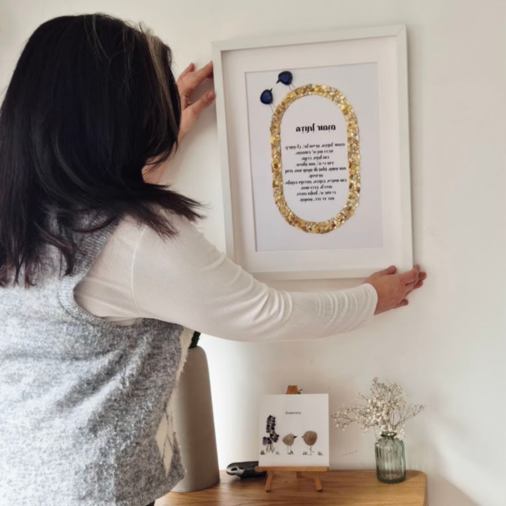 היצירה משלבת אבני קרמיקה בגוון כחול ים עמוק שנבחרו בקפידה ופסיפס של שברי צדפות בגווני שמש זהובים עם זוהר טבעי ואלגנטי, יחד עם טקסט מודפס באיכות גבוהה, בתוך מסגרת עץ עדינה בגודל 40×50 ס״מ — ליצירת פריט עיצובי בעל נוכחות שקטה ומשמעות עמוקה.