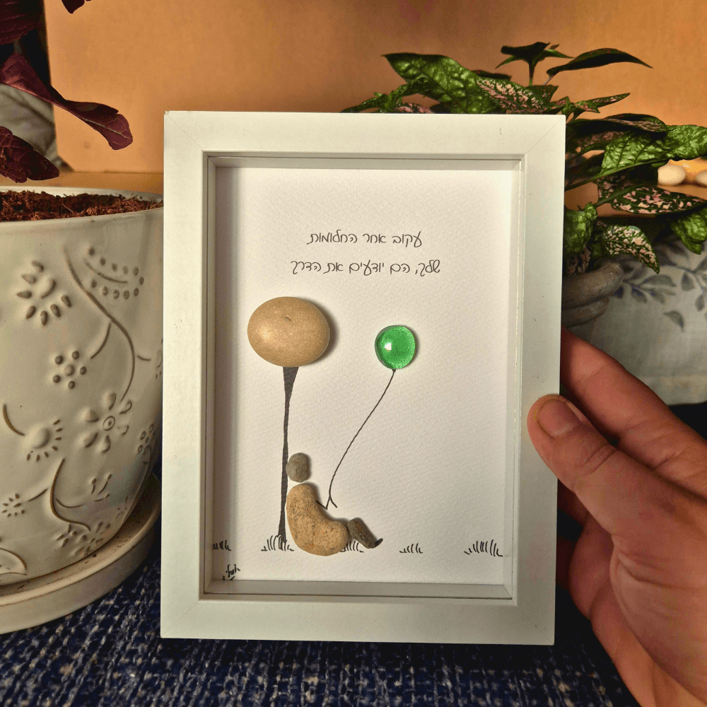 גודל היצירה הפנימי: 13×18 ס"מ | במסגרת עץ לבנה עמוקה ומזוגגת – קלילה לתלייה או להנחה על מדף.