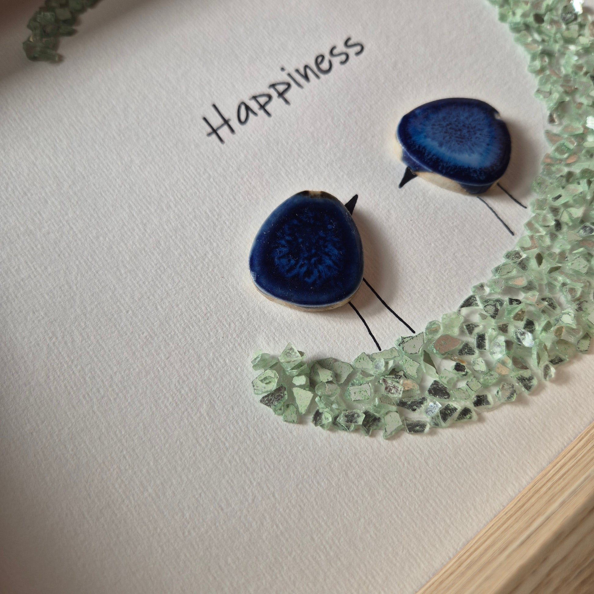 במרכז היצירה שני ציפורים מקרמיקה בגווני כחול עמוק – סמל לזוגיות, הרמוניה ואושר פשוט.